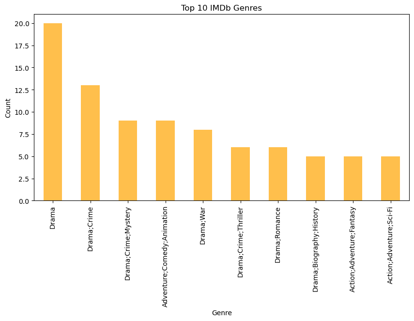 imdb_genres.head(10).plot(kind='bar', alpha=0.7, color='orange')